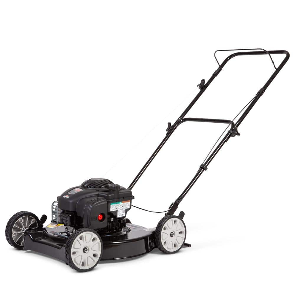 The Murray 20-inch cut gas push mower offers a lightweight. compact design for easy maneuverability. Starting is a breeze with the Prime ‘N Pull Easy Start System. Just prime the bulb on your mower three times and pull the cord for a guaranteed start. The Briggs & Stratton 125 cc engine provides great cutting power. This gas push mower has a 20-inch cutting blade and side discharge feature. Sturdy 7-inch wheels provide great support. Adjust the cutting height quickly and easily with 5-position. 4-wheel height adjustment. This gas push mower assembles quickly out of the box. with no tools required. Murray. Get it done. Go have fun.