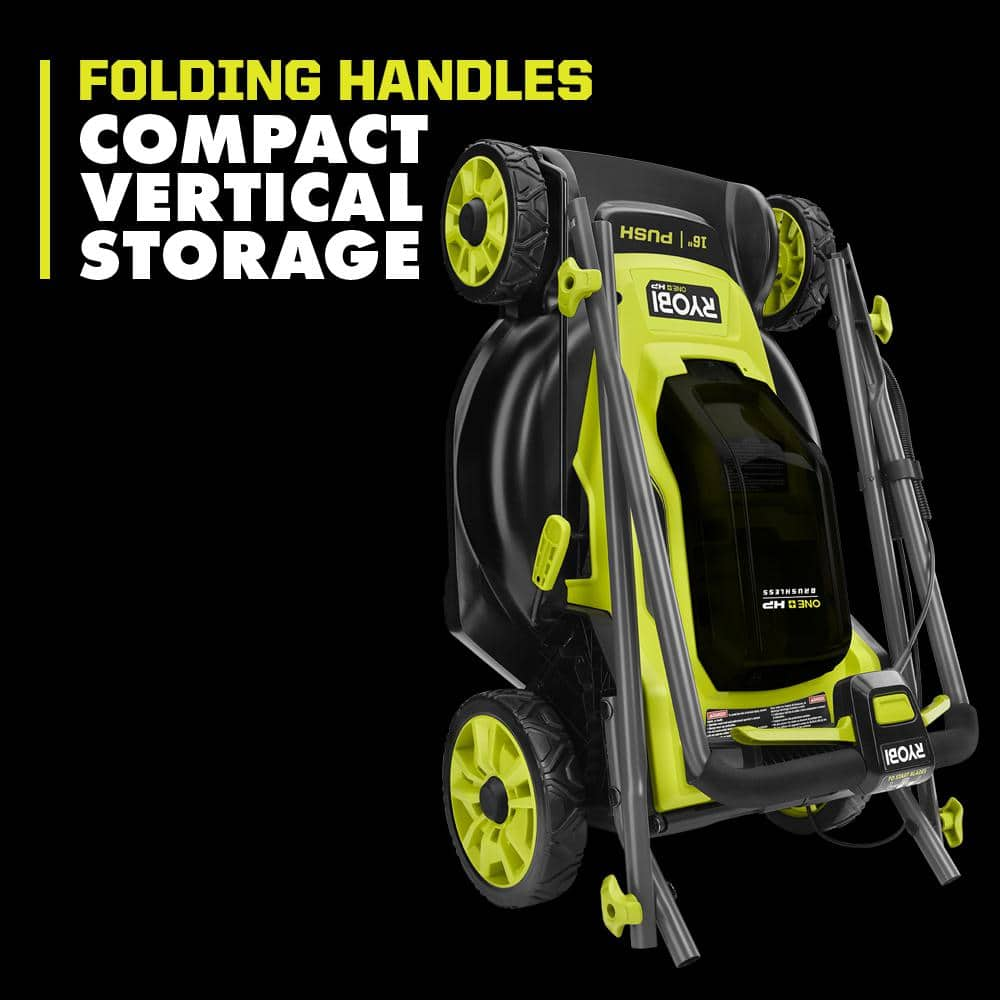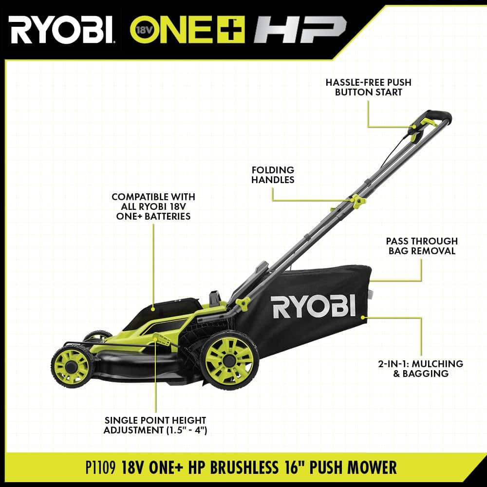 The RYOBI 18V ONE+ HP Brushless 16″ Push Mower delivers the power to tackle medium sized yards with ease. It’s ideal for up to 1/3 acre and runs for up to 40 minutes with the included (2) 18V ONE+ 4Ah batteries. The brushless motor and advanced electronics automatically react to mowing conditions by increasing the blade speed to eliminate bogging down and powering through the toughest cut. Experience exceptional performance with just the push of a button. without the hassle of gas or cords. For your utmost convenience. adjust the height of your cut with the 7-position single point height adjustment. With its easy lift bag removal and included mulch plug. switching between bagging and mulching is a breeze. When you are finished mowing. easily fold the handles and store vertically for compact storage. Best of all. it is part of the RYOBI 18V ONE+ system where any 18V ONE+ battery works with any 18V ONE+ product.